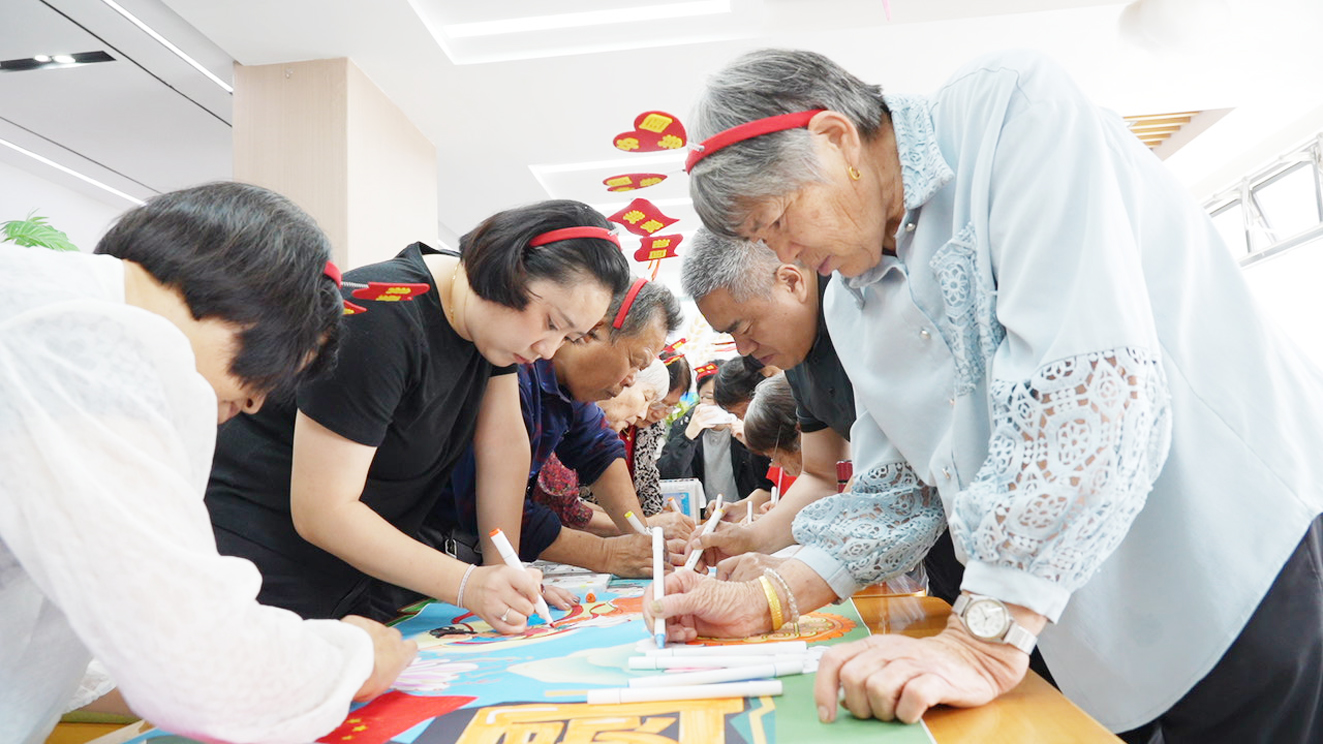 在活动现场,暖意融融。工作人员将长达5米的画布缓缓平铺在长桌上,画布上既有象征国庆的五星、天安门、华表等元素,也融入了中秋玉兔、圆月、桂花等传统符号,吸引了老人的目光。他们踊跃参与,纷纷拿起水彩笔,围在画布旁投入创作,每一笔都格外认真,仔细勾勒线条边缘。大家默契配合,在涂色的同时,不时交流着色彩搭配的想法,工作人员也穿梭在老人之间,耐心协助行动不便的老人递笔、调色,还为他们讲解画布上的图案寓意。现场欢声笑语不断,温馨氛围格外浓厚。